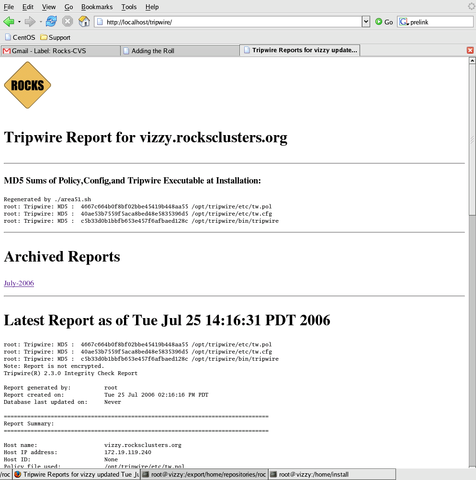 When this cron script runs successfully, tripwire sends mail to root (default). The cron script also creates a web page which shows the most recent tripwire report and web-archives of previous reports.