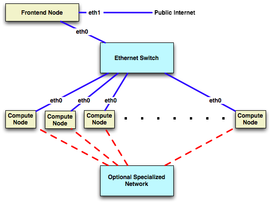 On the frontend, at least two ethernet interfaces are required. The interface that Linux maps to eth0 should be connected to the same ethernet network as the compute nodes. The interface that Linux maps to eth1 should be connected to the external network (e.g., the internet or your organization's intranet).