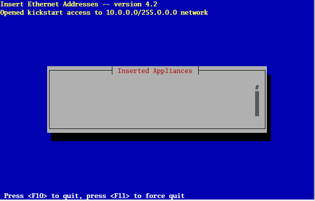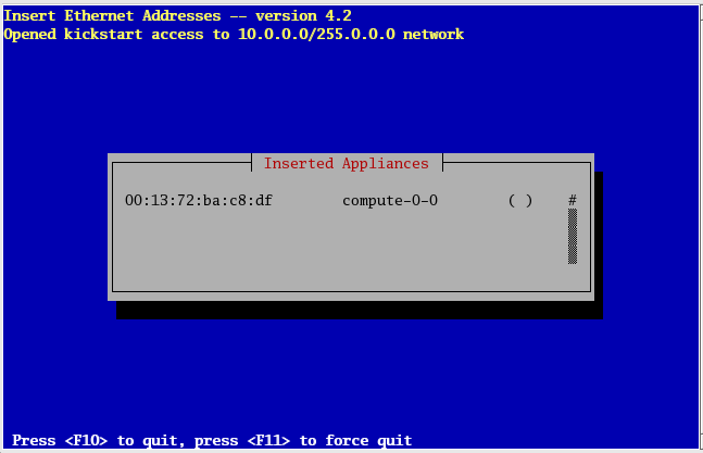 After you've installed all the compute nodes in a cabinet, quit insert-ethers by hitting the 'F8' key.
