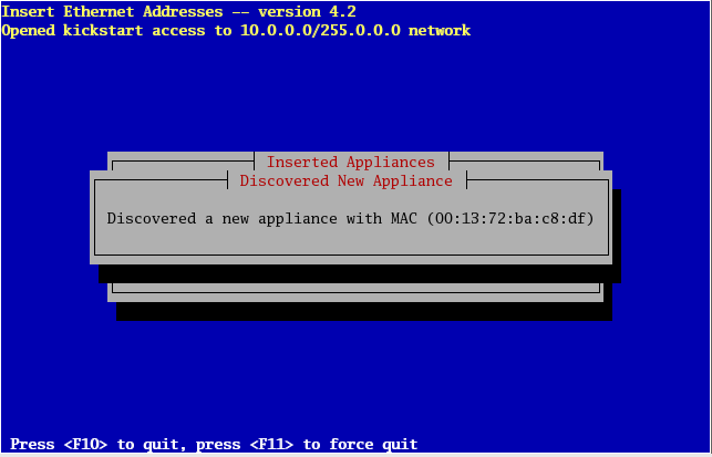 ![]() | If your frontend and compute nodes are connected via a managed ethernet switch, you'll want to select 'Ethernet Switches' from the list above. This is because the default behavior of many managed ethernet switches is to issue DHCP requests in order to receive an IP address that clients can use to configure and monitor the switch. When insert-ethers captures the DHCP request for the managed switch, it will configure it as an ethernet switch and store that information in the MySQL database on the frontend. As a side note, you may have to wait several minutes before the ethernet switch broadcasts its DHCP request. If after 10 minutes (or if insert-ethers has correctly detected and configured the ethernet switch), then you should quit insert-ethers by hitting the F8 key. Now, restart insert-ethers and continue reading below to configure your compute nodes. |