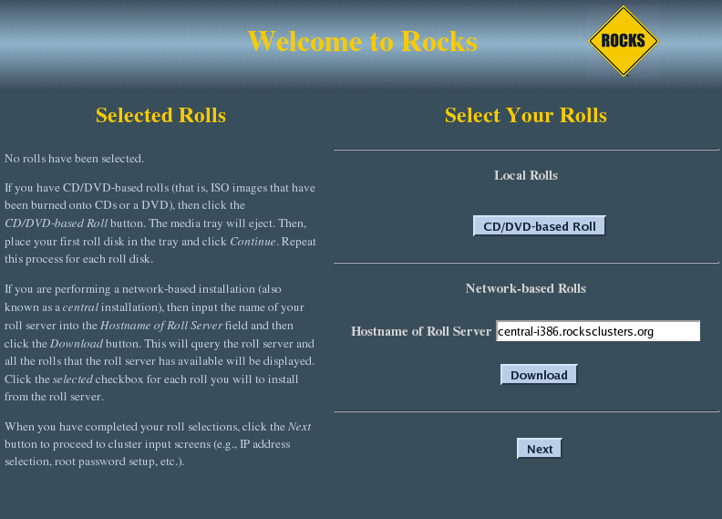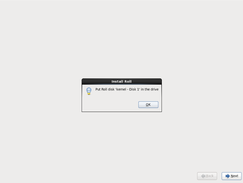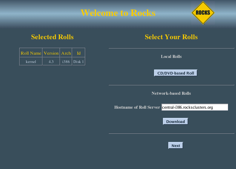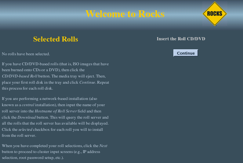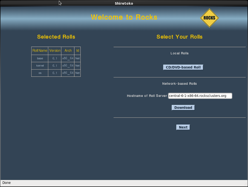 ![]() | For the remainder of this section, we'll use the example of installing a bare-bones frontend, that is, we'll be using the Kernel/Boot Roll, base Roll, OS - Disk 1 Roll and the OS - Disk 2 Roll. |