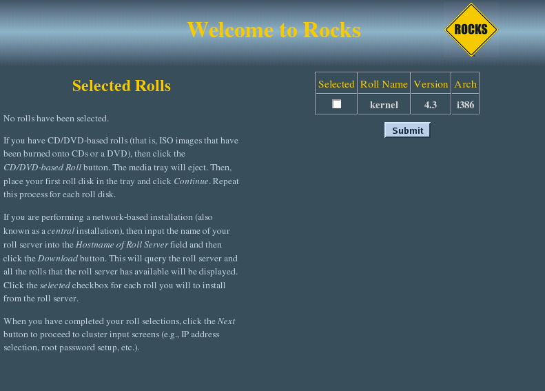 Select the Kernel/Boot Roll by checking the 'Selected' box and clicking the 'Submit' button.