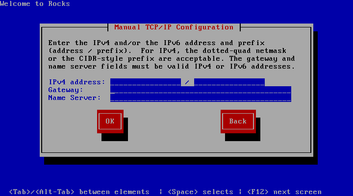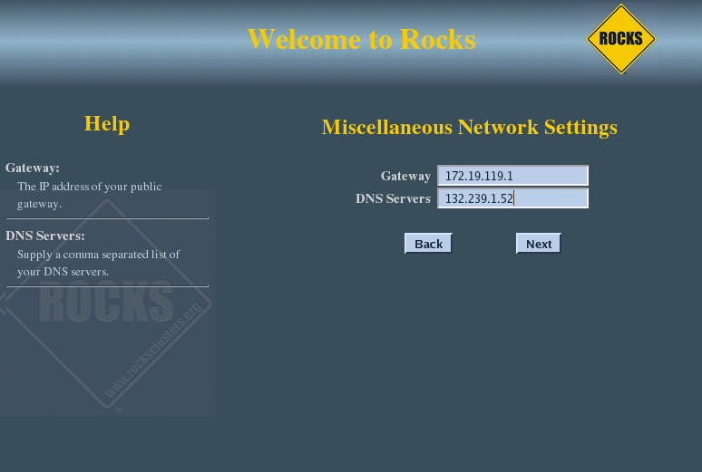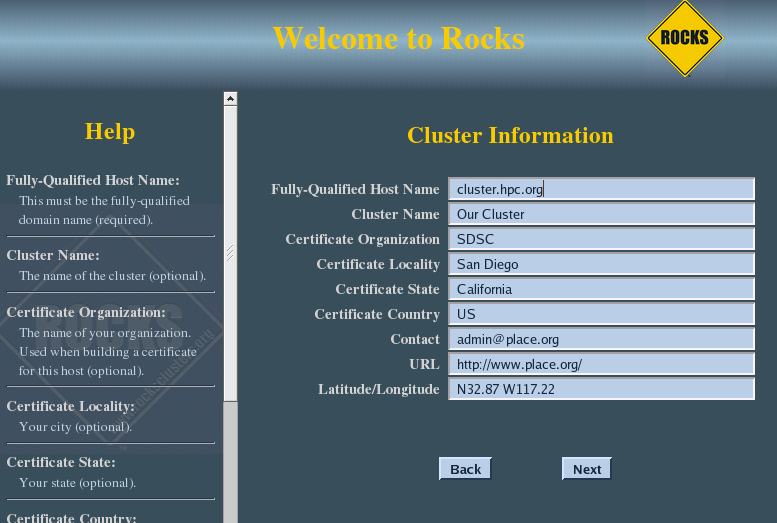 ![]() | The one important field in this screen is the Fully-Qualified Host Name (all other fields are optional). Choose your hostname carefully. The hostname is written to dozens of files on both the frontend and compute nodes. If the hostname is changed after the frontend is installed, several cluster services will no longer be able to find the frontend machine. Some of these services include: SGE, NFS, AutoFS, and Apache. |