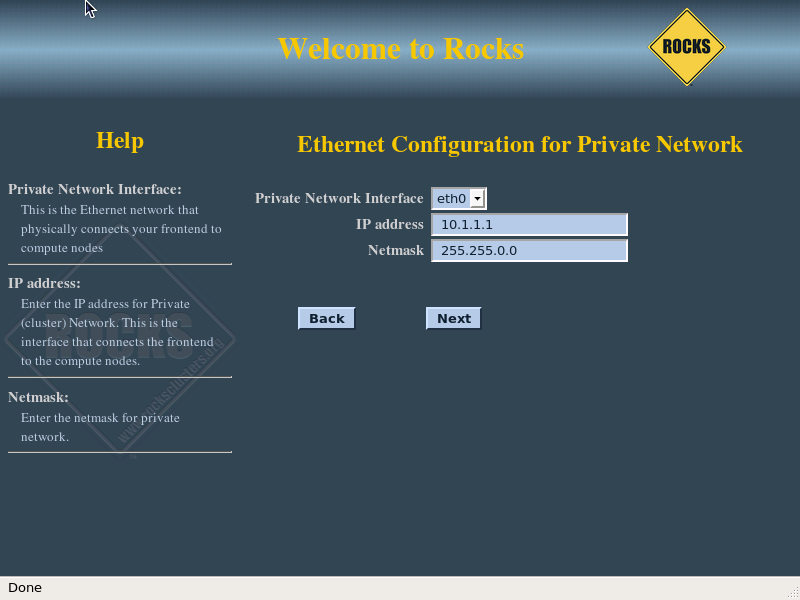The private cluster network configuration screen allows you to set up the networking parameters for the ethernet network that connects the frontend to the compute nodes.