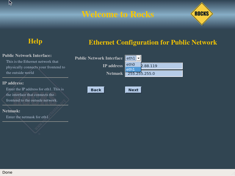 The public cluster network configuration screen allows you to set up the networking parameters for the ethernet network that connects the frontend to the outside network (e.g., the internet).