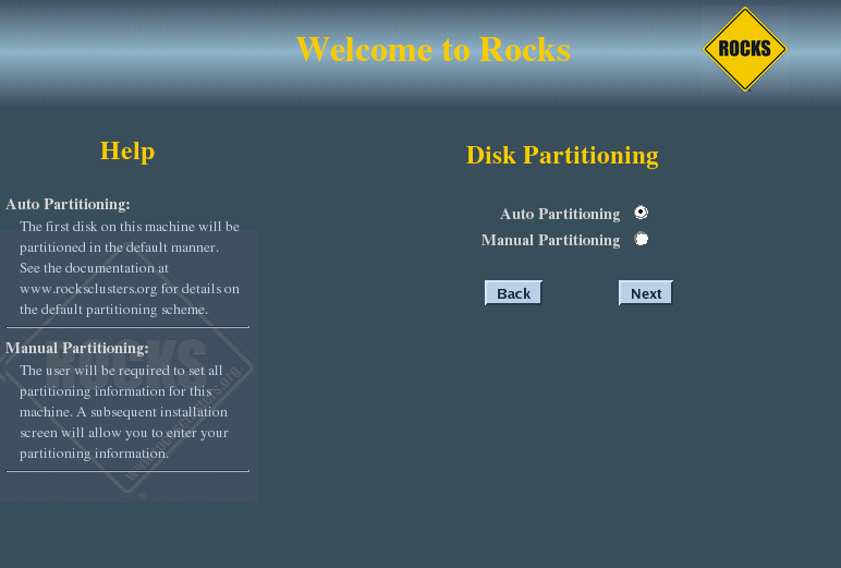 To select automatic partitioning, click the Auto Partitioning radio button. This will repartition and reformat the first discovered hard drive that is connected to the frontend. All other drives connected to the frontend will be left untouched.