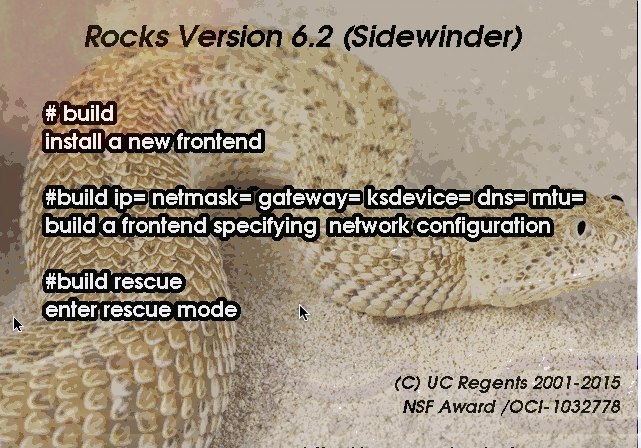 ![]() | The "boot:" prompt arrives and departs the screen quickly. It is easy to miss. If you do miss it, the node will assume it is a compute appliance, and the frontend installation will fail and you will have to restart the installation (by rebooting the node). |