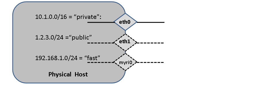 There are three types of interfaces that a cluster owner may need to be concerned about: physical, logical, and VLAN (virtual LAN) bridges. Linux (and other OSes like Solaris) support logical interfaces that share a particular physical network port. The following shows physical network devices and associations of those devices to a named network (or subnet, used interchangably in this discussion). In the figures below, the /<nn> notation is a standard method of how to specify the number of bits in the netmask. Examples include: /24=255.255.255.0 (Class C subnet), /16=255.255.0.0 (Class B subnet), /8=255.0.0.0 (Class A subnet) and /25=255.255.255.128