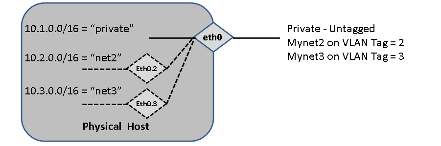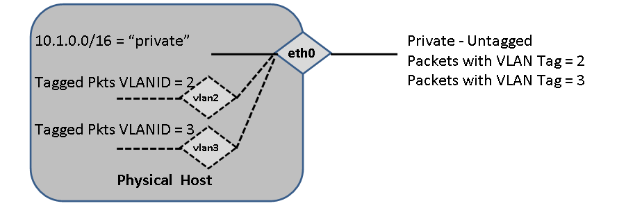 Linux supports VLAN tagging on virtual interfaces (i.e., IEEE 802.1Q). For example, if a host has physical interface eth0 (untagged), then the kernel can send and receive a tagged packets if a properly defined interface named eth0.<vlan> has been created and properly configured. Tagging allows the same physical network to be partitioned into many different networks. A key feature of VLAN tagging is that a broadcast packet (e.g. a DHCPDISCOVER packet) only broadcasts on the tagged VLAN in which is was initially sent.