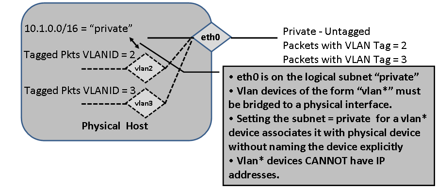 At this stage, the vlan interfaces are not currently associated with any physical network device. Linux will not configure these devices on the node without the association. We overload the meaning of subnet in this case to mean: "associate the logical vlan device with the physical device that is in subnet 'x'". As an example, we can associate both vlan2 and vlan3 to be tagged packet interfaces on the the subnet named private.